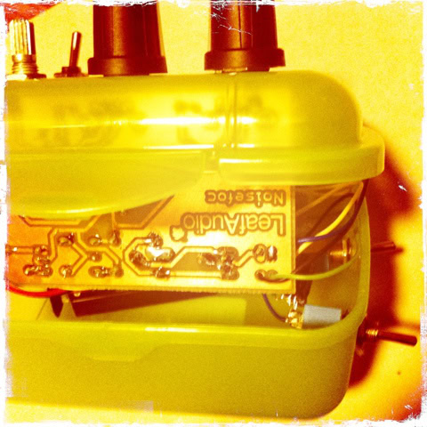 „Noisefoc: Der Noisefoc hat 3 Oszillatoren, welche sich gegenseiting modulierenn können. Zur Steuerung der Frequenzen werden Potis und ein Lichtwiderstand benutzt, über den das Gerät auch mit Lichtquellen wie Taschenlampen etc. steuerbar ist. Ein Chaos-Regler lässt die Schaltung bei Bedarf vollends aus dem Ruder laufen und produziert Noise hoch 10. Zwischen hochfrequent fietschendem Noise, tiefen Drones, und rhythmischem Klacken geht einiges. Der Ausgang ist als 6,3mm Klinke ausgeführt.“ (LeafAudio)