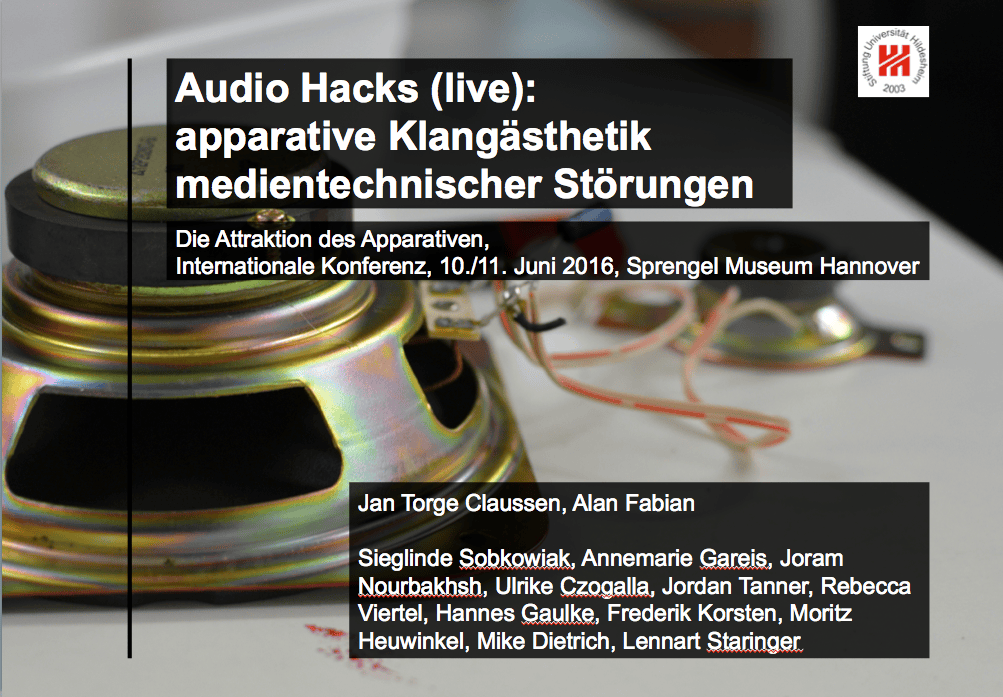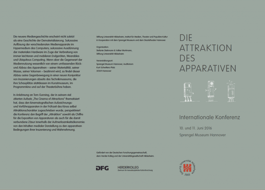 Vortrag und Projektpräsentation gemeinsam mit Studierenden der Universität Hildesheim auf der Konferenz „Die Attraktion des Apparativen“ im Sprengel Museum Hannover.